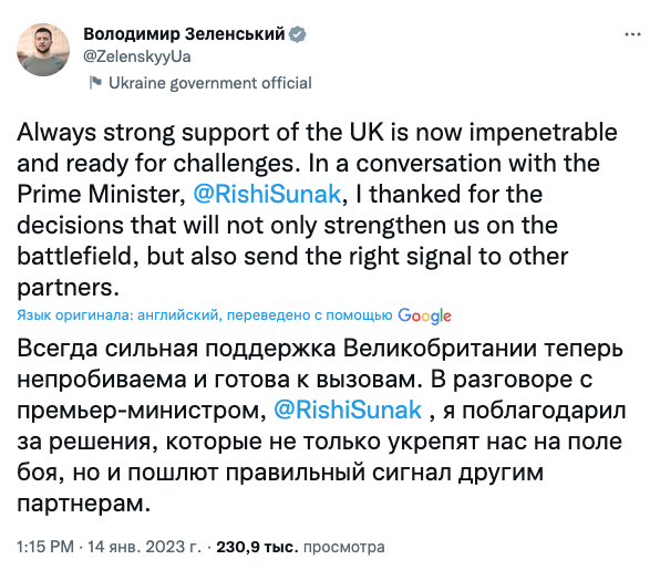 Зеленський подякував Сунаку, зазначивши, що це "надсилає правильний сигнал іншим партнерам".