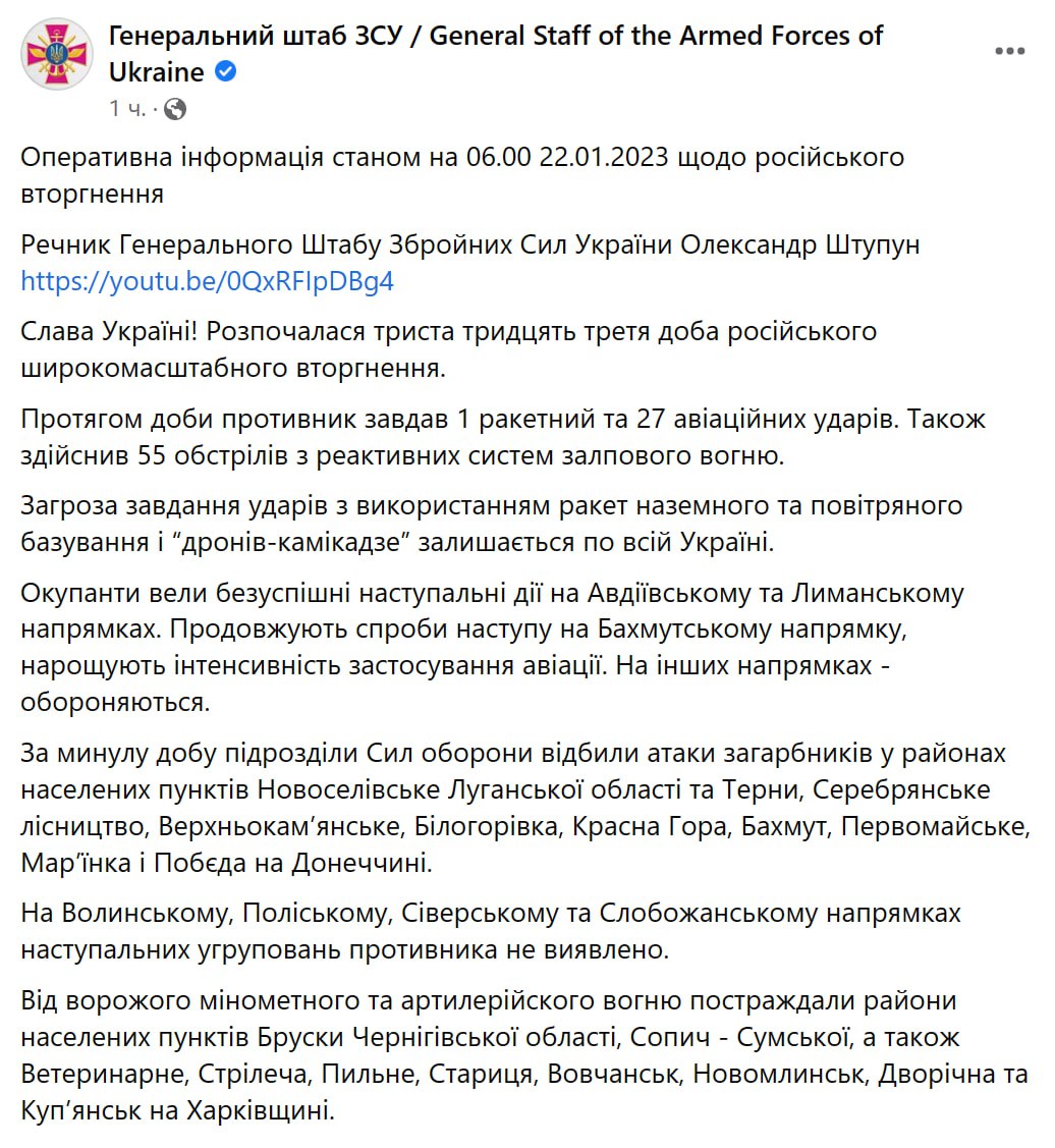 У Генеральному штабі Збройних сил України опублікували оперативне зведення з фронту станом на 6:00 22 січня.