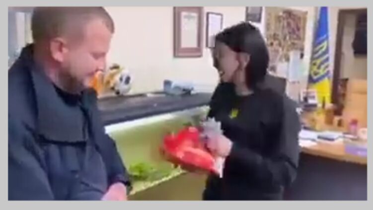 На ньому дівчина розпаковує вручений їй презент і радісно кричить: "Перепустка через площу Ринок на мій Мерседес!" і цілує свого хлопця – начальника патрульної поліції.