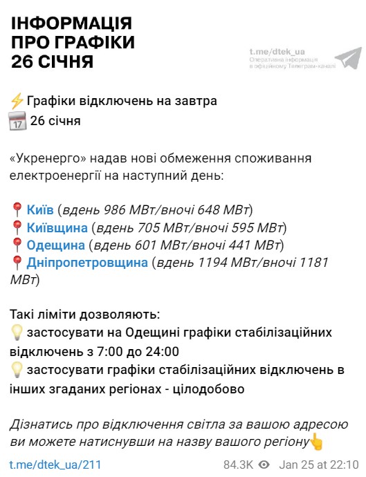 На Одещині в ніч з 25 на 26 січня будуть аварійні відключення, у Київській, Дніпропетровській та Києві - лише планові.