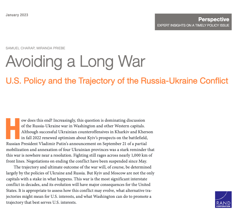 Відомий американський дослідницький центр RAND corporation (серед його клієнтів - Пентагон) у своїй доповіді "Уникнути довгої війни" робить висновок про те, що жодна зі сторін у війні в Україні не досягне "абсолютної перемоги".