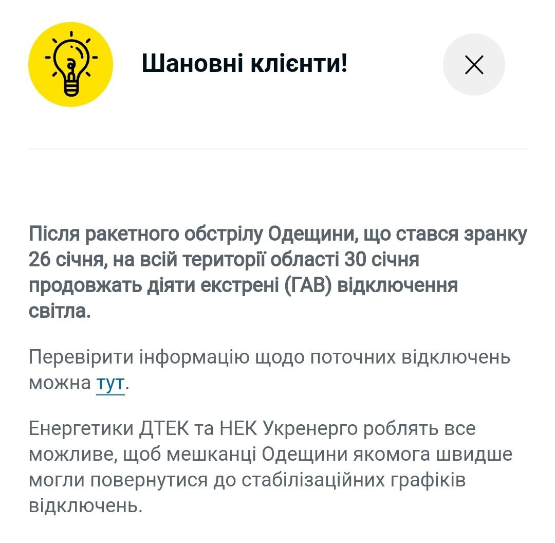 Нагадаємо, в Одеській області російські ракети 26 січня вразили два об'єкти енергетики. Загалом була ситуація складна, екстрені відключення продовжаться, говорили у ДПЕК.