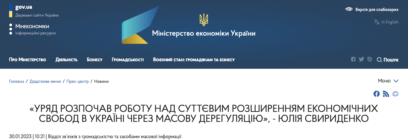 "Ми ліквідуємо інструменти, які заважають бізнесу нормально працювати. Суттєво спростимо та оцифруємо інструменти, необхідні для захисту інтересів суспільства. Роботу починаємо з інструментів, якими займається Міністерство економіки. Майже половина з них буде ліквідована, а решта – осучаснена. Надалі МРГ пропрацює інструменти регулювання, що стосуються сфери компетенції інших органів влади. Наше завдання – дати бізнесу економічну свободу", – заявила міністр економіки Юлія Свириденко.