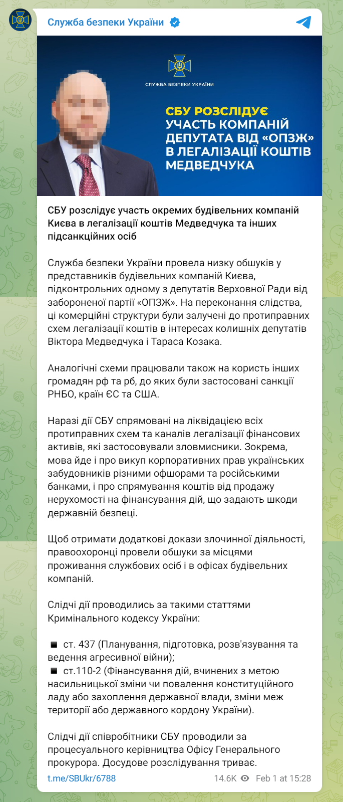 СБУ підозрює будкомпанії Столара у легалізації коштів Медведчука та інших підсанкційних осіб