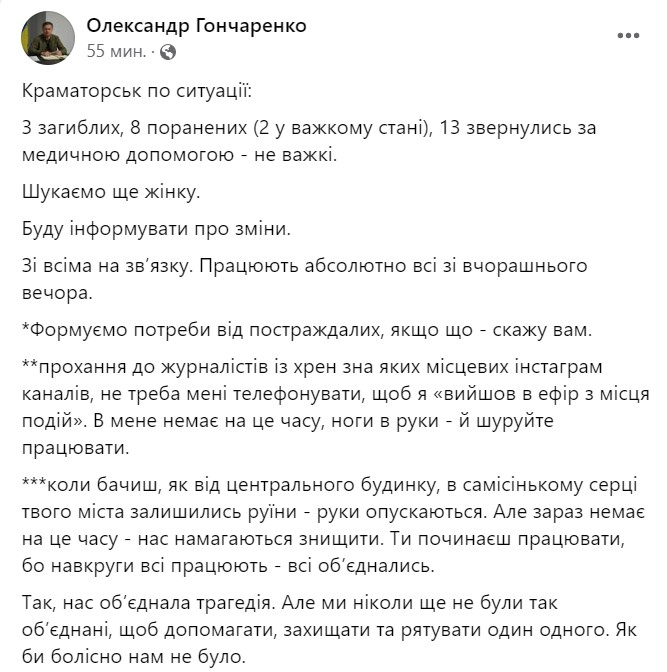 "Троє загиблих, вісім поранених (двоє у важкому стані). 13 звернулися за медичною допомогою - не важкі. Шукаємо ще жінку. Інформуватиму про зміни", - написав він.