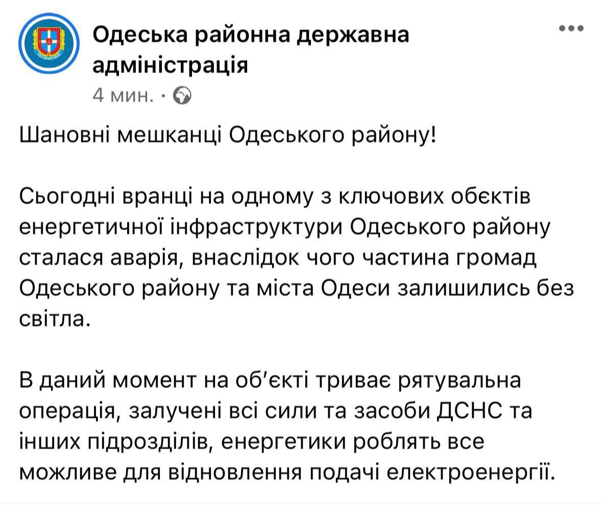 08.41 Влада підтвердила аварію на одному з об'єктів енергетики в Одеській області.