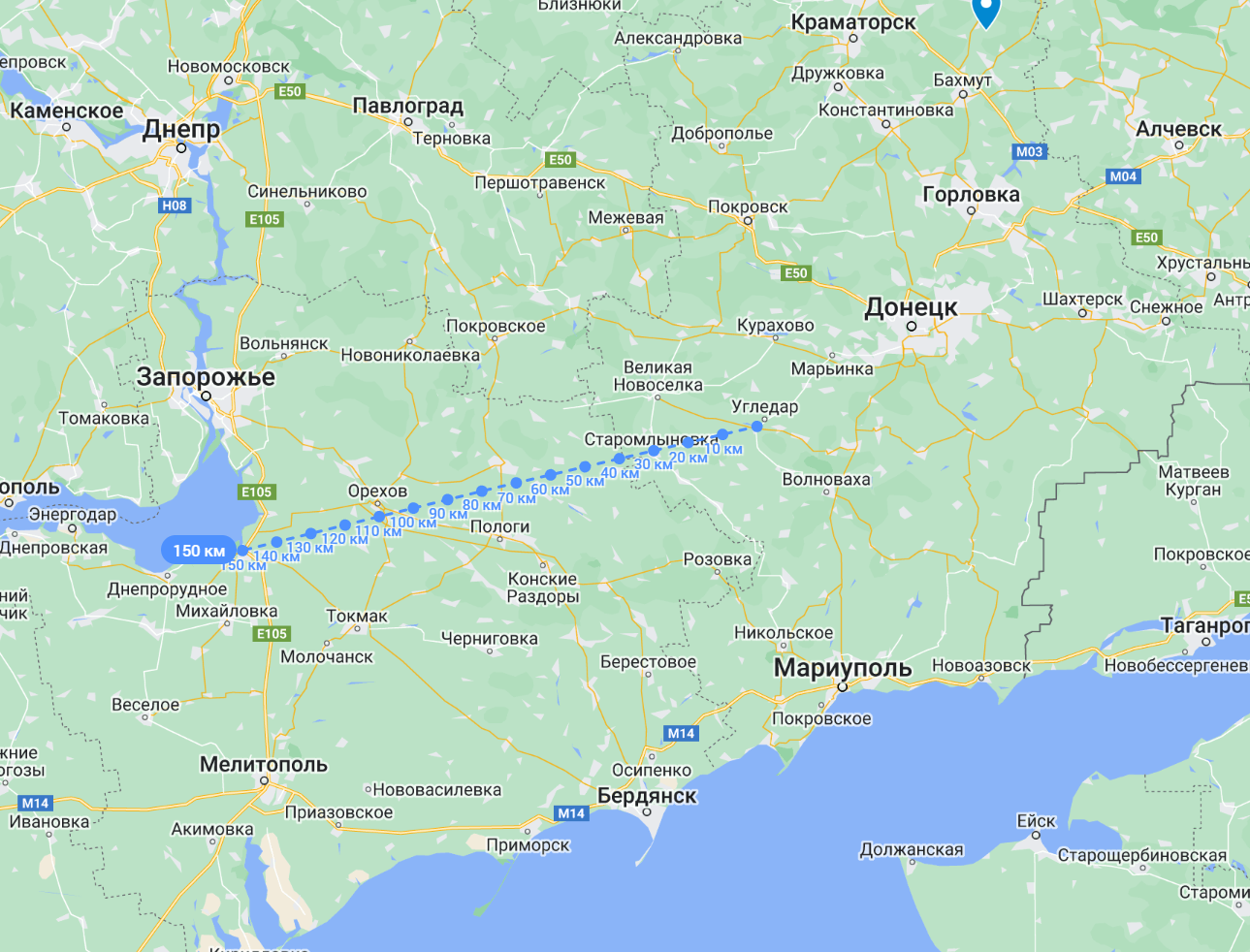 Атака на південному фронті поставила під загрозу основні шляхи постачання українських сил на Донбасі. Але противнику потрібно пройти від нинішньої лінії фронту до траси Дніпро-Донецьк 50-60 км.