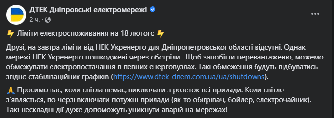 "Завтра ліміти від НЕК Укренерго для Дніпропетровської області відсутні. Однак мережі НЕК Укренерго пошкоджено через обстріли. Щоб запобігти перевантаженню, можемо обмежувати електропостачання у певних енерговузлах. Такі обмеження відбуватимуться згідно з стабілізаційними графіками", - пише ДТЕК.