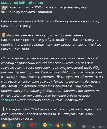 Нагадаємо, Міносвіти рекомендувало школам України перейти на дистанційне навчання з 22 по 24 лютого через загрозу ракетних ударів.