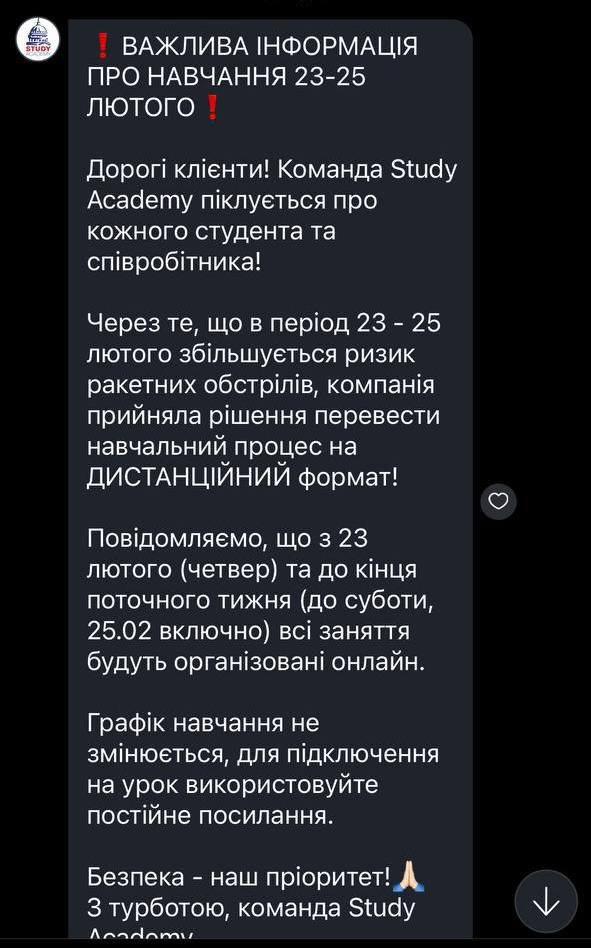 "Через те, що в період з 23 по 25 лютого збільшується ризик ракетного обстрілу, компанія вирішила перевести навчальний процес на дистанційний формат".