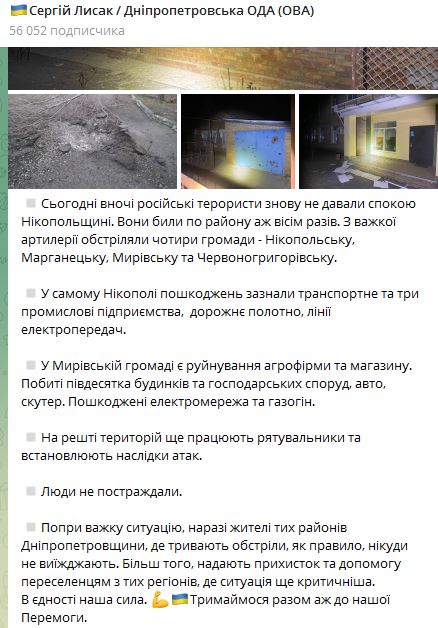 "Били по району цілих вісім разів. З важкої артилерії обстріляли чотири громади - Нікопольську, Марганецьку, Мирівську та Червоногригорівську", - повідомив голова ОВА.