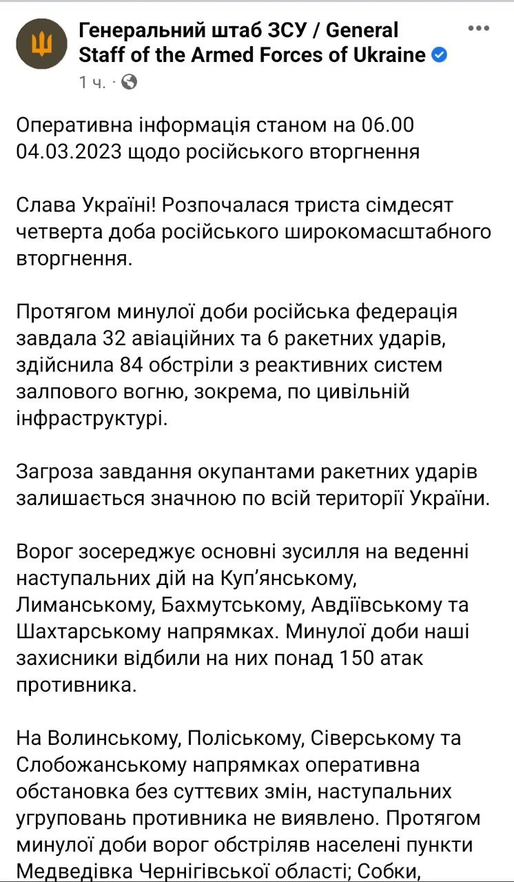 07.39 Головне зі зведення Генштабу ЗСУ на ранок 4 березня.