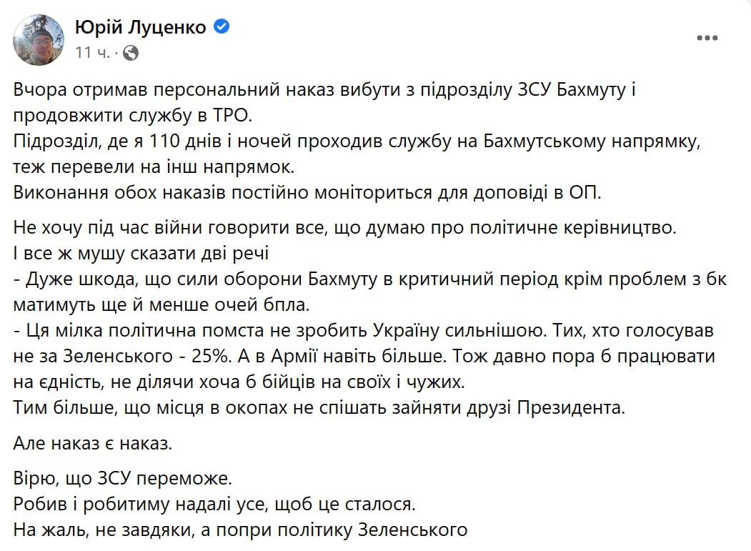 Підрозділ, де я служив у напрямку Бахмута протягом 110 днів і ночей, також перевели на інший напрямок. Виконання обох наказів постійно контролюється в ОП", - повідомив Луценко.