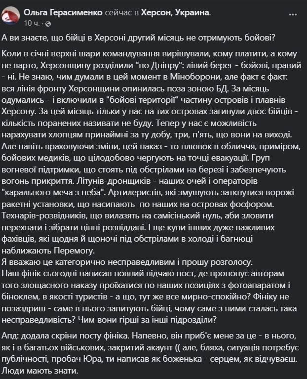 "Коли у січні верхні верстви командування вирішували, кому платити, а кому не варто, Херсонщину розділили 'Дніпром': лівий берег – бойові, правий – ні. Не знаю, чим думали в цей момент у Міноборони, але факт є факт: вся лінія фронту Херсонщини опинилася поза зоною БД, через місяць одумалися - і включили в 'бойові території' частину островів і плавнів Херсона.За цей місяць тільки у нас на тих островах загинули два бійці - кількість поранених називати не буду.Тепер у нас є можливість нарахувати хлопцям принаймні за добу, три, п'ять, що вони на виході. Але навіть з огляду на зміни, цей наказ – це плювок в обличчя, наприклад, бойових медиків, які цілодобово чергують на точці евакуації", - пише Ольга Герасименко.
