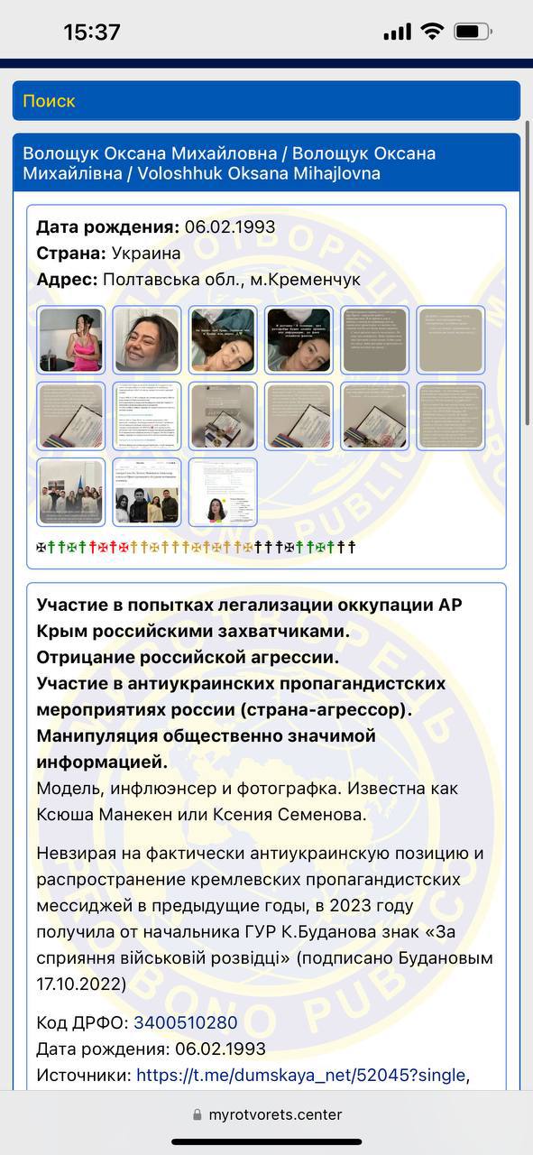 15.45 Блогерку Ксюшу Манекен, яка отримала відмінність від ГУР "за сприяння військовій розвідці України ІІ ступеня, сьогодні внесли до бази "Миротворець".