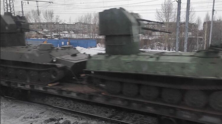 У російських військових Telegram-каналах з'явилися кадри ешелону із броньованими тягачами-транспортерами МТ-ЛБ, із встановленими на них корабельними зенітними установками 2М-3М із 25-мм автоматичними знаряддями.