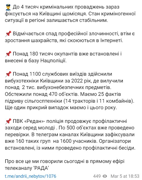 Про це повідомив у неділю, 5 березня, голова поліції Київської області Андрій Небутов у ефірі телеканалу "Рада".