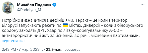 "Потрібно визначитися з дефініціями. Теракт - це коли з території Білорусі запускають ракети українськими містами. Диверсії - коли з білоруського кордону заходять ДРГ. Удар по літаку-коригувальнику А-50 - антитерористичний акт, скоєний, до речі, місцевими партизанами", - наголосив Подоляк.