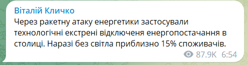 06:56 Через ракетну атаку в Києві почали екстрені відключення світла, повідомив Кличко.