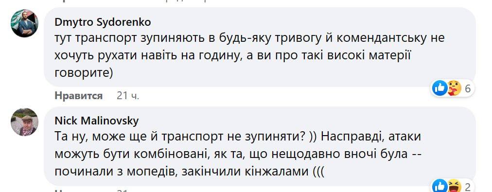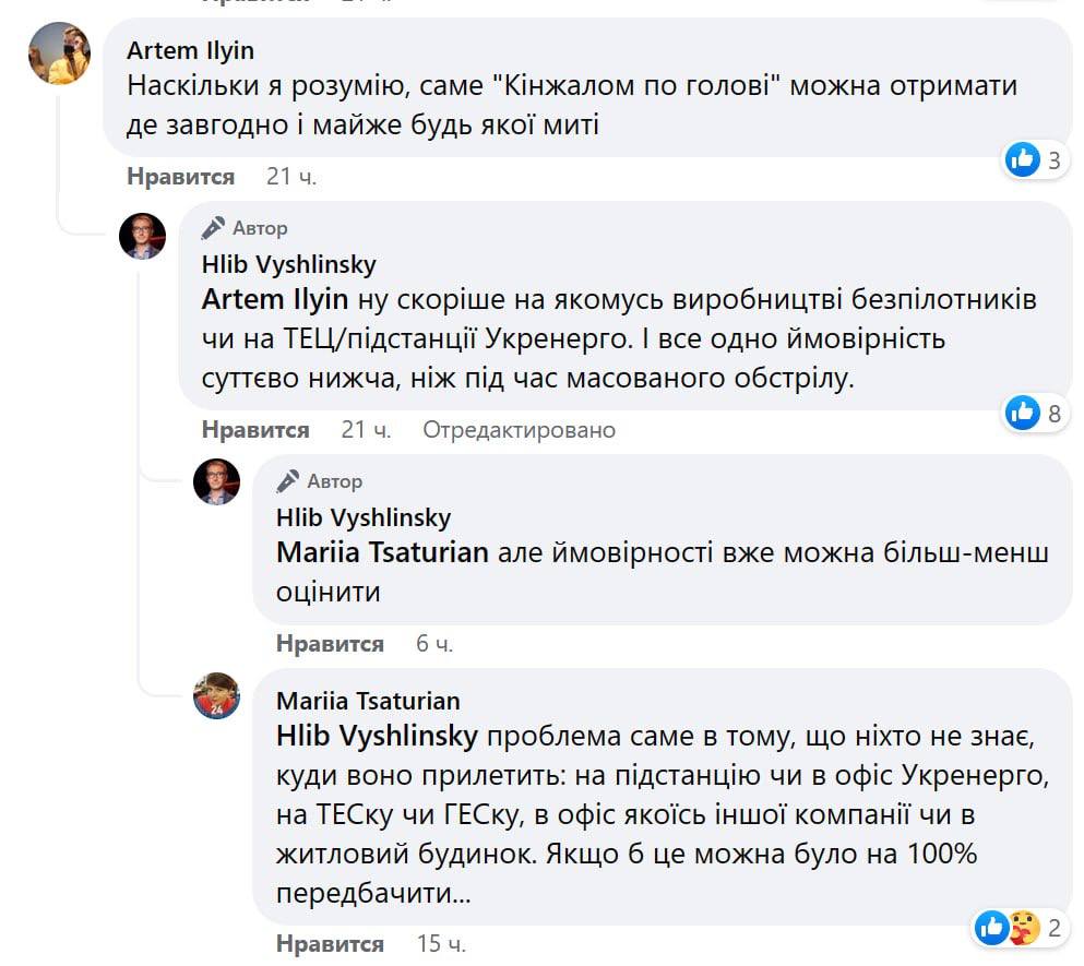 У коментарях із цього приводу розгорнулася полеміка. Співробітниця "Укренерго" Марія Цатурян пише, що "ніхто не знає, куди воно прилетить: на підстанцію чи до офісу Укренерго, на ТЕС чи ГЕС, до офісу якоїсь іншої компанії чи до житлового будинку". Тому оголошуються масові тривоги.