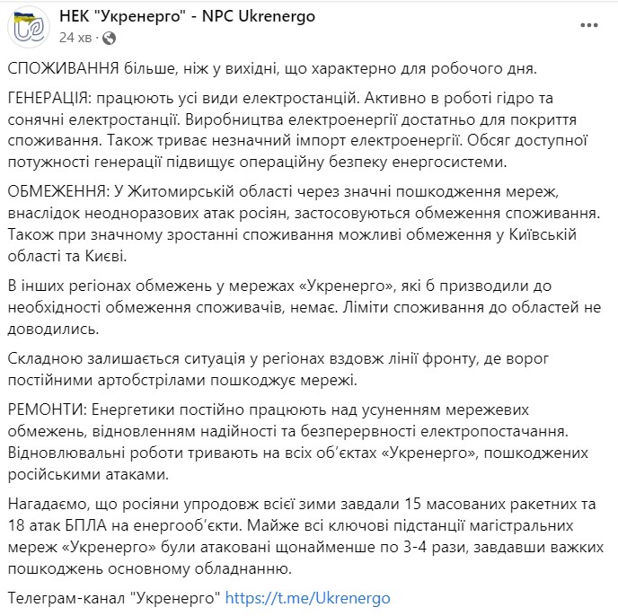Про це повідомляє Укренерго у своєму телеграм-каналі.