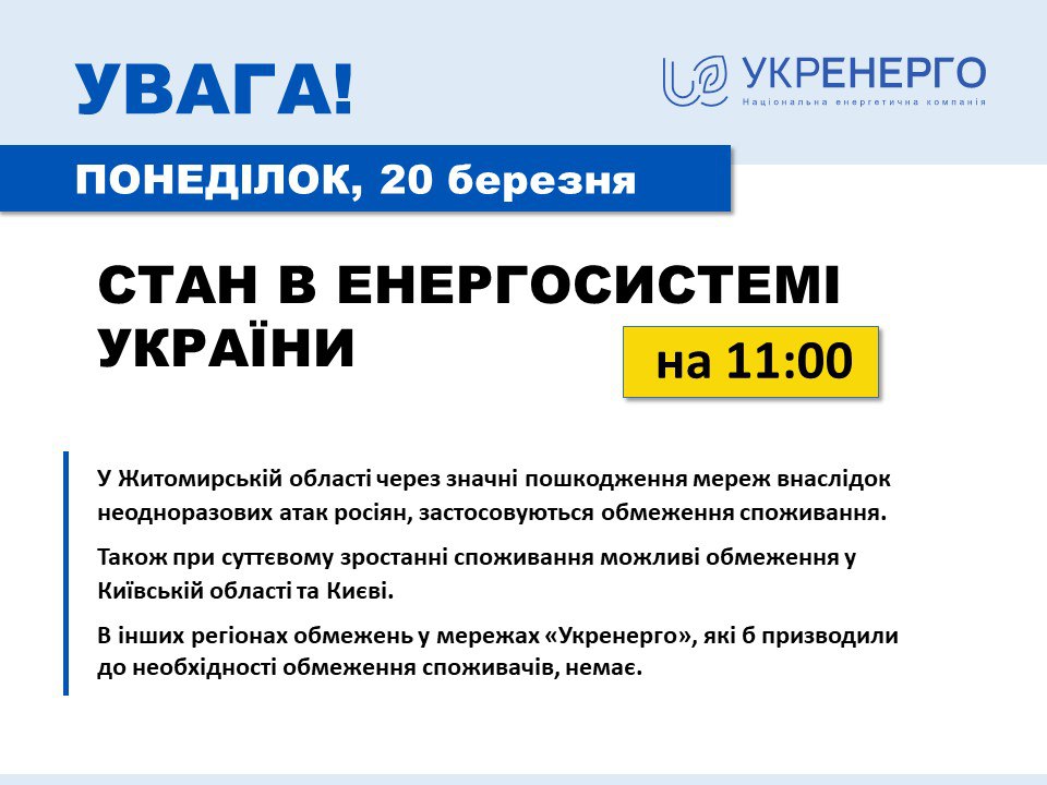 На Житомирщині у понеділок, 20 березня, через значні пошкодження мереж застосовуються обмеження споживання. Також можливі у разі зростання споживання обмеження у Києві та Київській області.