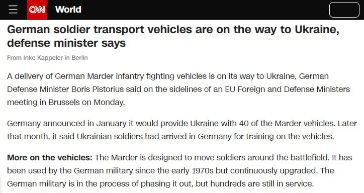 Німеччина розпочала постачання бойових машин піхоти Marder до України. Вони вже перебувають у дорозі, заявив міністр оборони Німеччини Борис Пісторіус.