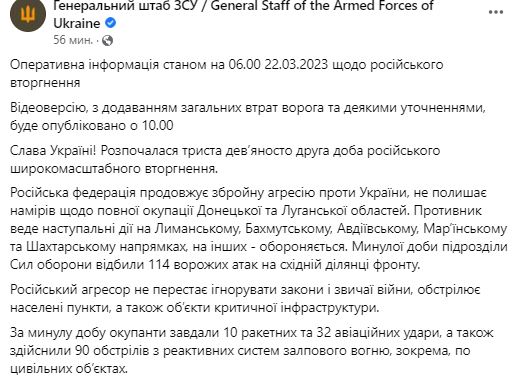У середу, 22 березня, в Україні триває вже 392-й день війни з РФ.