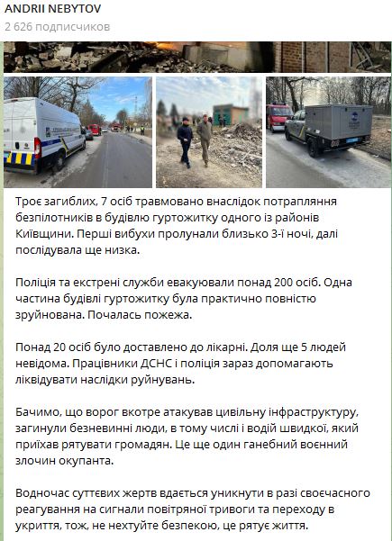 Трьох загиблих, 7 людей травмовано внаслідок потрапляння безпілотників до будівлі гуртожитку одного з районів Київщини. Перші вибухи прогриміли близько 3 ночі, далі був ще ряд.