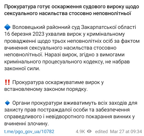 Прокуратура готує оскарження судового вироку Воловецького районного суду на Закарпатті щодо зґвалтування неповнолітньої дівчинки.