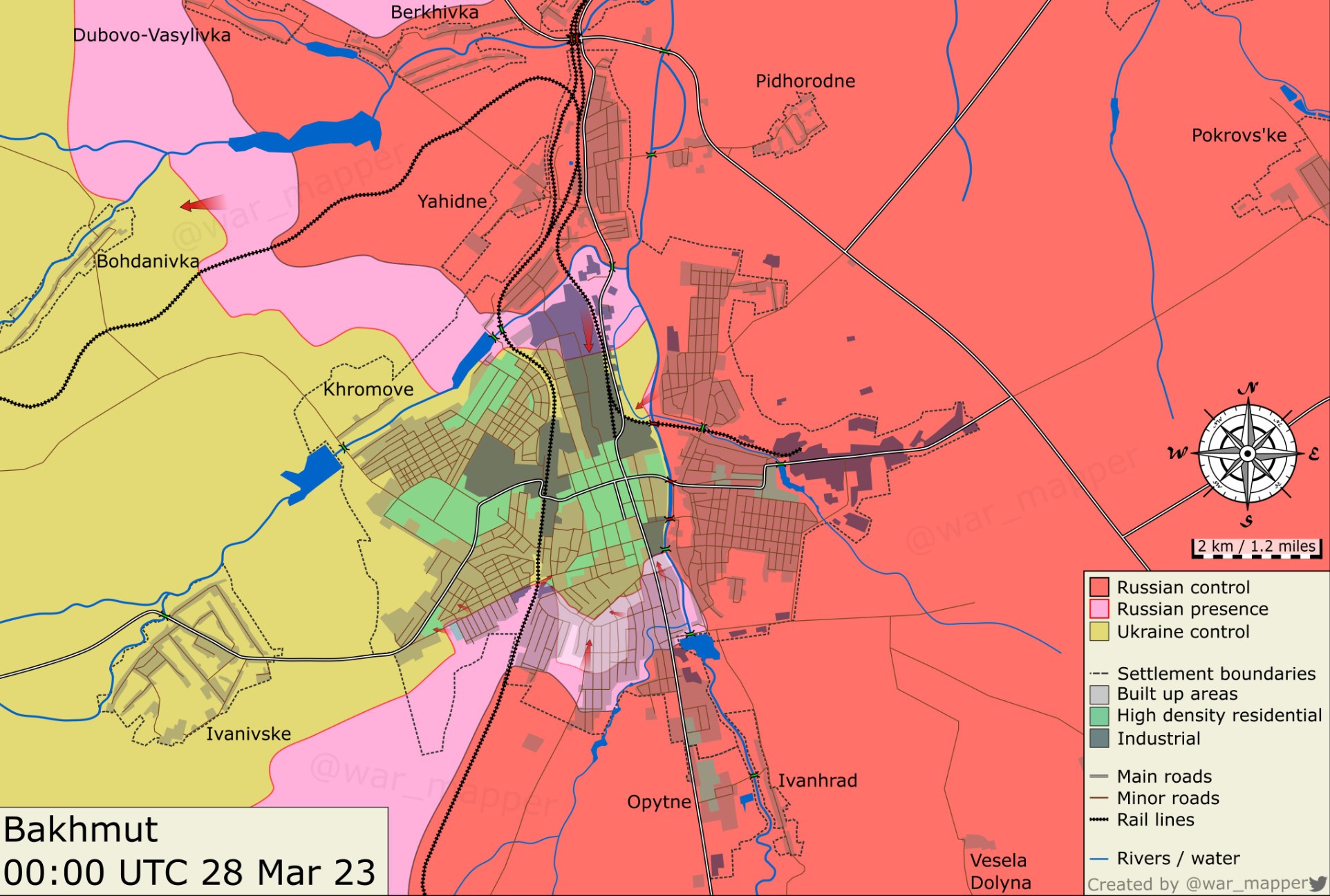 "Інститут вивчення війни" (США) відзначає низку поступів росіян усередині Бахмута. А саме – вулицями Зеленої та Олександри Колпакової на північному заході Бахмута. А також у межах заводу кольоромета на півночі Бахмута (самі "вагнерівці" стверджують, що контролюють цехи заводу, але адмінбудівлю за ЗСУ).