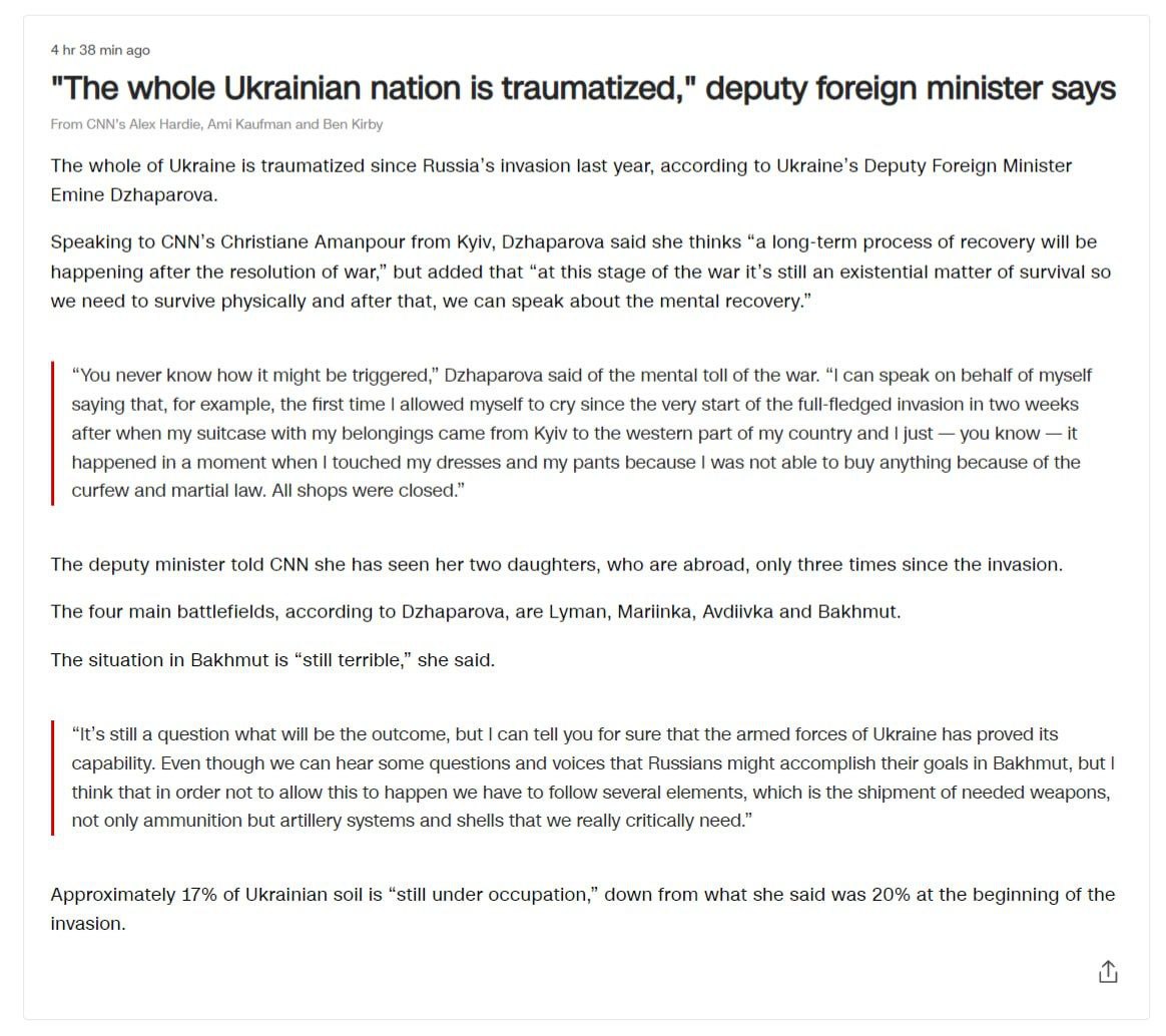 "Ще питання, яким буде результат, але можу точно сказати, що Збройні сили України довели свою боєздатність. Хоча ми чуємо деякі питання та голоси, що росіяни можуть досягти своїх цілей у Бахмуті, але я думаю, що для того, щоб цього не сталося, ми повинні дотримуватися кількох елементів, а саме постачання необхідної зброї, не тільки боєприпасів, а й артилерійських систем і снарядів, яких ми справді гостро потребуємо", - сказала Джапарова.