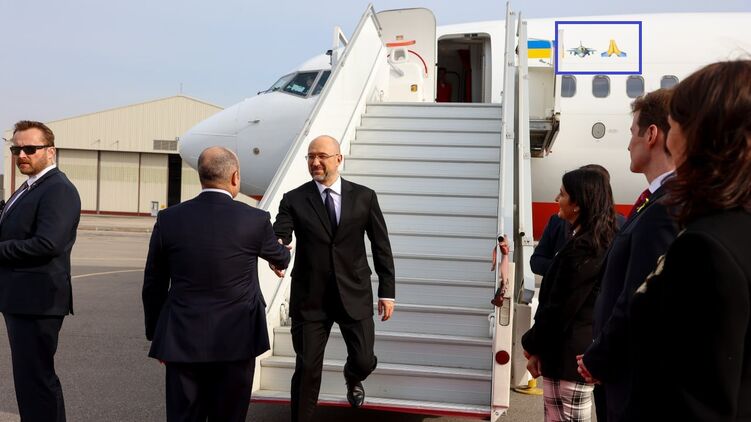 Прем'єр-міністр України Денис Шмигаль прилетів до Канади літаком зі смайликами. Три емодзі намальовані на борту біля дверей лайнера.