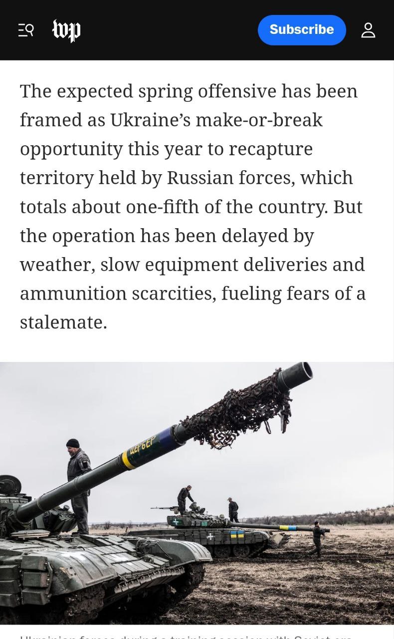 Україна відклала контрнаступ "через погоду, повільне постачання обладнання та нестачу боєприпасів, що посилило побоювання тупикової ситуації ".