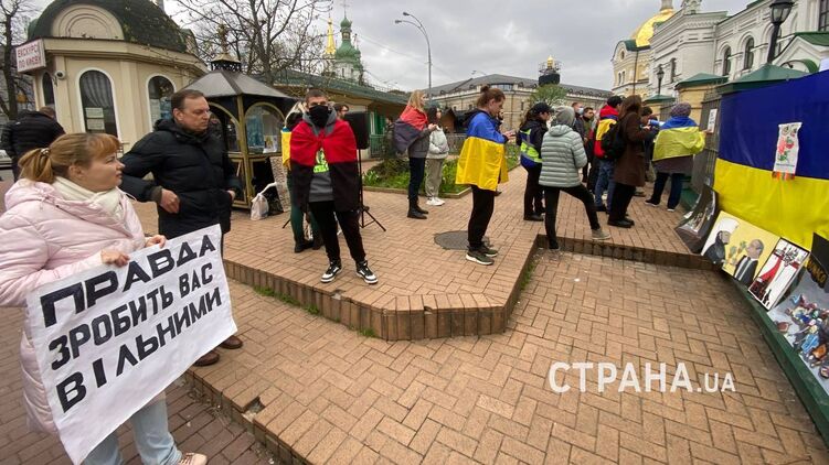 Біля головного входу до Києво-Печерської лаври у четвер, 13 квітня, проводять акції противники Української православної церкви з вимогами виселити ченців УПЦ із Лаври.