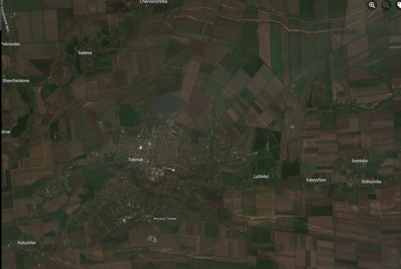 Видно ланцюжка окопів навколо захоплених Токмак і Пологів.