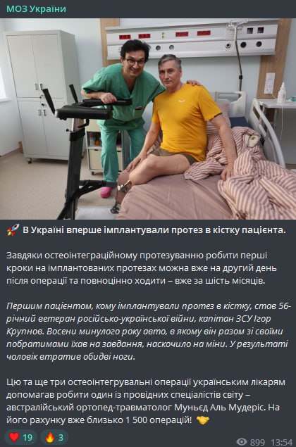 14.05 В Україні вперше імплантували протез у кістку, повідомляє МОЗ.