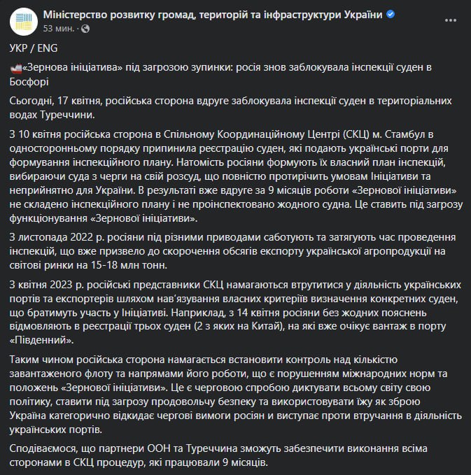 Як повідомляється, з 10 квітня російська сторона у Спільному Координаційному центрі у Стамбулі в односторонньому порядку припинила реєстрацію суден, які подають українські порти для формування інспекційного плану.