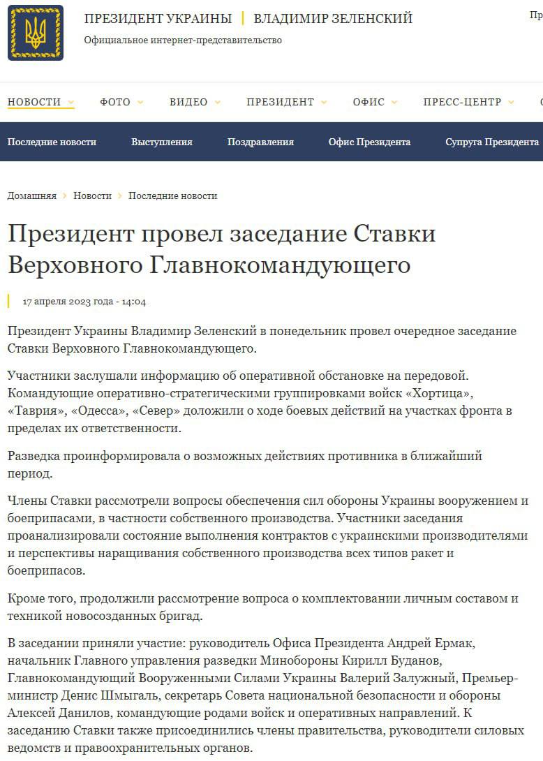 3. Повідомив про підготовку до чергового "Рамштайну" та висловив надію на виділення зброї, яка відповідає амбіційним завданням України на полі бою. Побічно висловив невдоволення тим, що Захід не виділяє необхідних наступу види озброєнь.