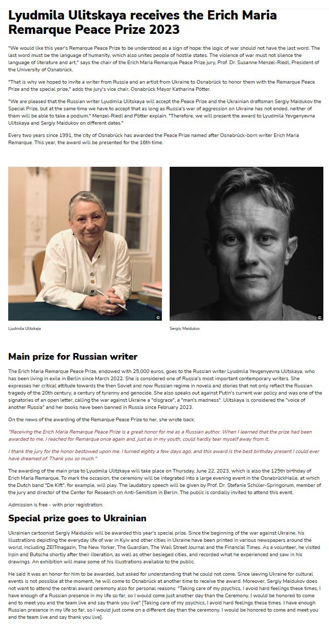 Український ілюстратор Сергій Майдуков відмовився приїхати на вручення премії Ремарка в Оснабрюку (Німеччина), зокрема через те, що головний приз присудили росіянці.