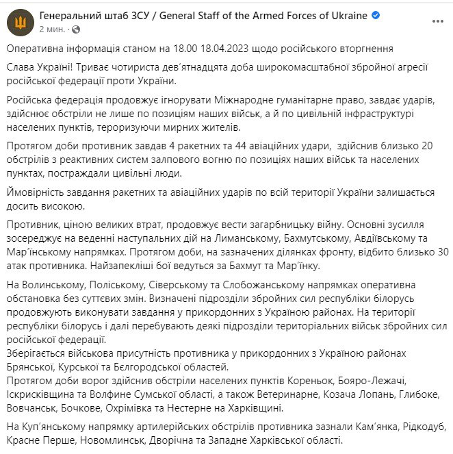 У вівторок, 18 квітня, Генштаб Збройних сил України опублікував вечірнє зведення з фронту.