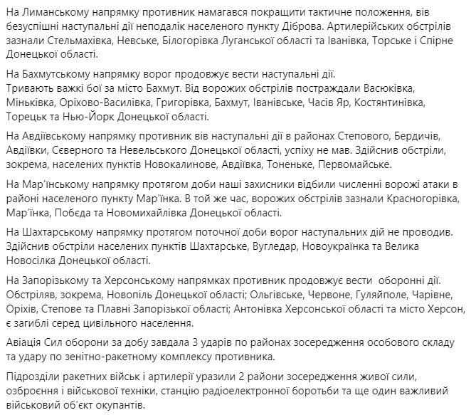 2. Відбито близько 30 атак на напрямках: Лиманському – у районі Діброви; Бахмутському – у Бахмуті; Авдіївському – у районах Степового, Бердичева, Авдіївки, Північного та Невельського; Мар'їнському – у районі Мар'їнки.
