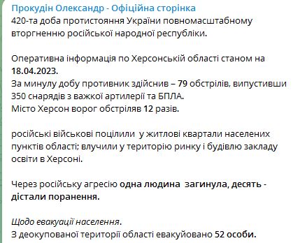 Внаслідок російської агресії в Херсоні та області вчора одна людина загинула, десять – отримали поранення.