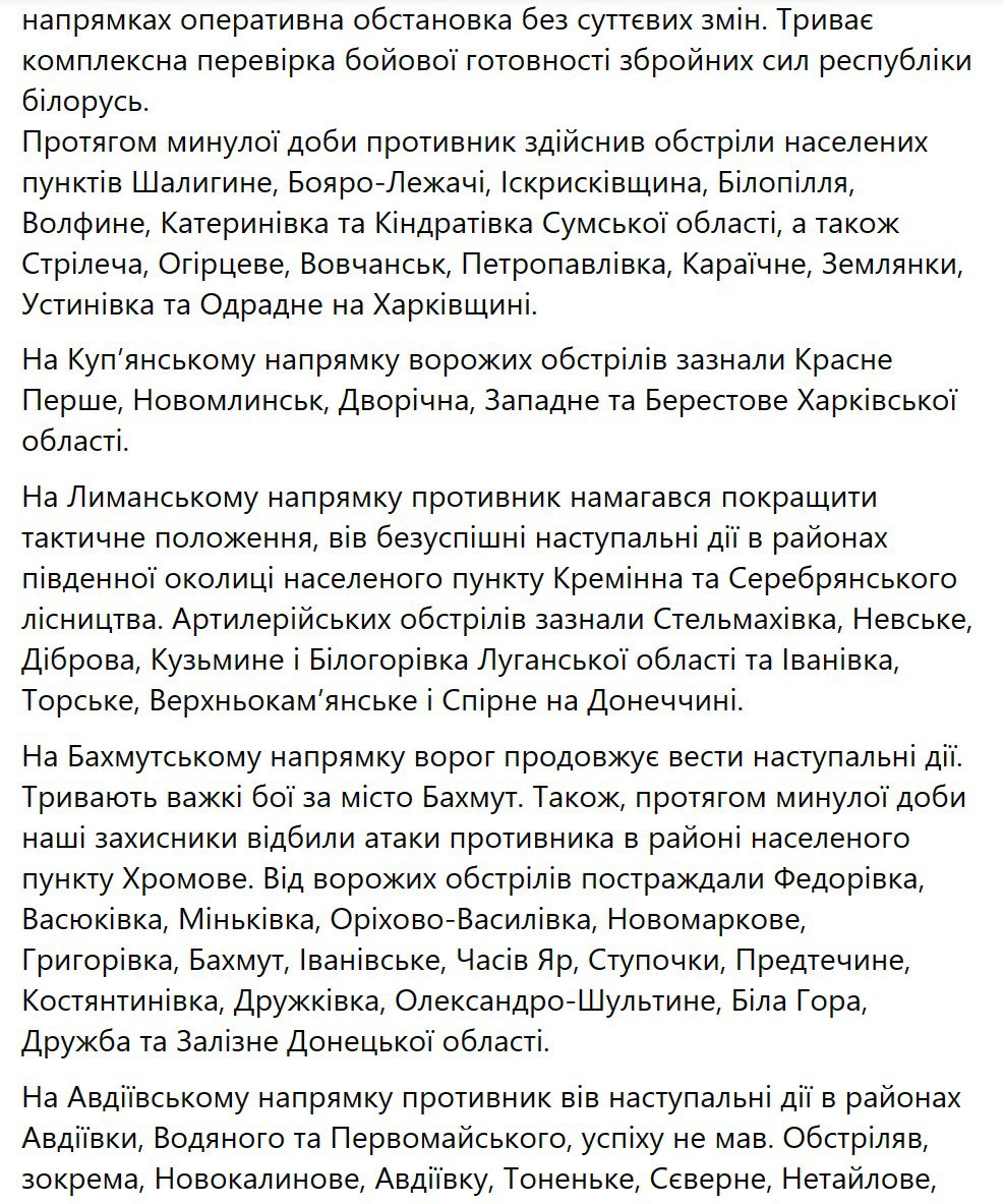 3. На Волинському, Поліському, Сіверському, Слобідському, Куп'янському, Запорізькому та Херсонському напрямах ситуація без істотних змін.