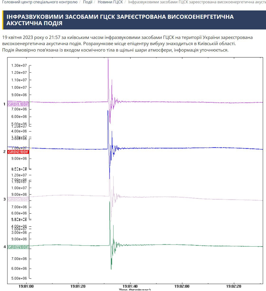 Головний центр спеціального контролю при космічному агентстві України заявив, що спостерігалася "високоенергетична акустична подія", причиною якої стало падіння якогось космічного тіла.