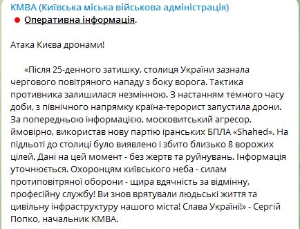 07.00 Вночі РФ атакувала з безпілотників Київ.
