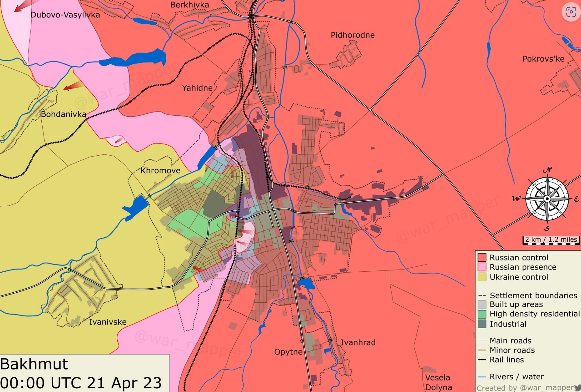 "Сили "Вагнера" атакували біля Хромова і змогли просунутися до невказаного шосе — ймовірно, 00506 — яке українські сили використовують як наземну лінію зв'язку в Бахмут. На кадрах з геолокацією, опублікованих 20 квітня, видно, як українські сили обстрілюють російські позиції на північ -заходу від Хромово", - йдеться у зведенні "Інституту".
