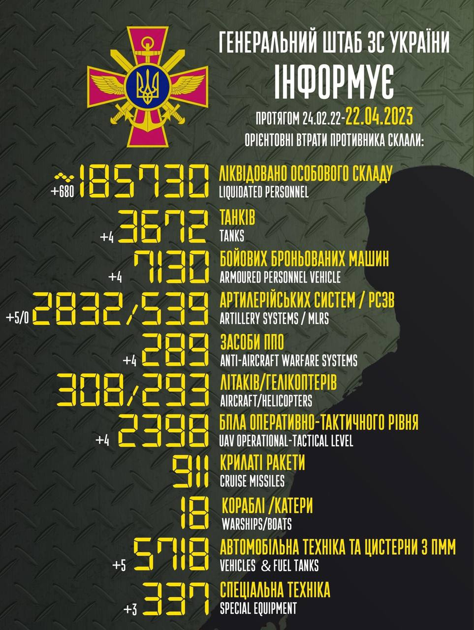 Генштаб Збройних сил України (ЗСУ) озвучив загальні бойові втрати армії Росії за час війни в Україні – з 24 лютого 2022 року по 22 квітня 2023 року.