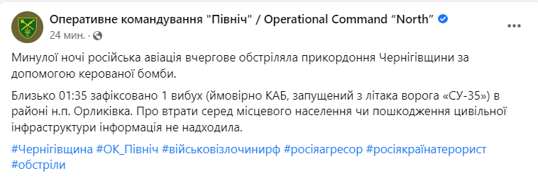 "Близько 01:35 зафіксовано 1 вибух (ймовірно, КАБ, запущений з літака ворога СУ-35) в районі н.п. Орликівка. Про втрати серед місцевого населення або пошкодження цивільної інфраструктури інформація не надходила", - заявили військові.