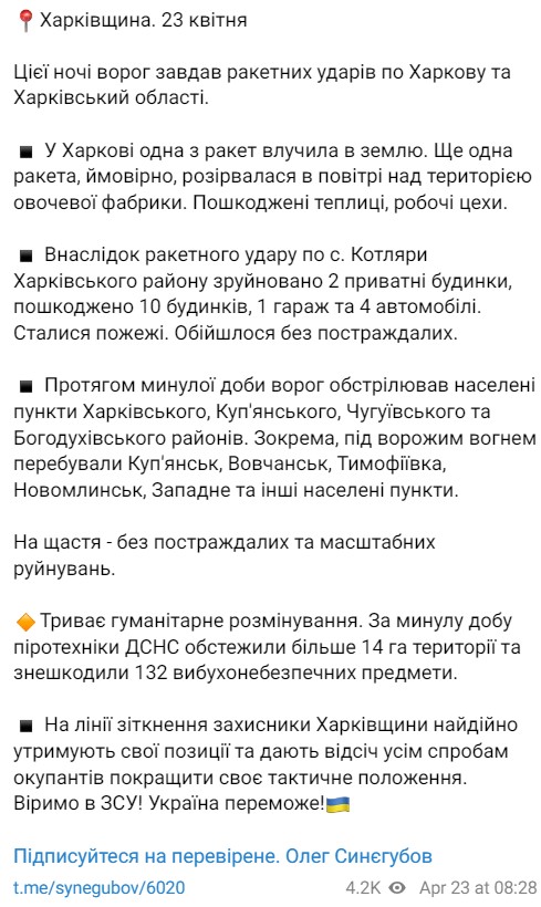 У ніч на 23 квітня було завдано ракетних ударів по Харкову та Харківській області. Внаслідок цього інциденту в Харкові одна з ракет впала в землю, а інша, можливо, розірвалася у повітрі над овочевою фабрикою, що призвело до пошкодження теплиць та робочих цехів.